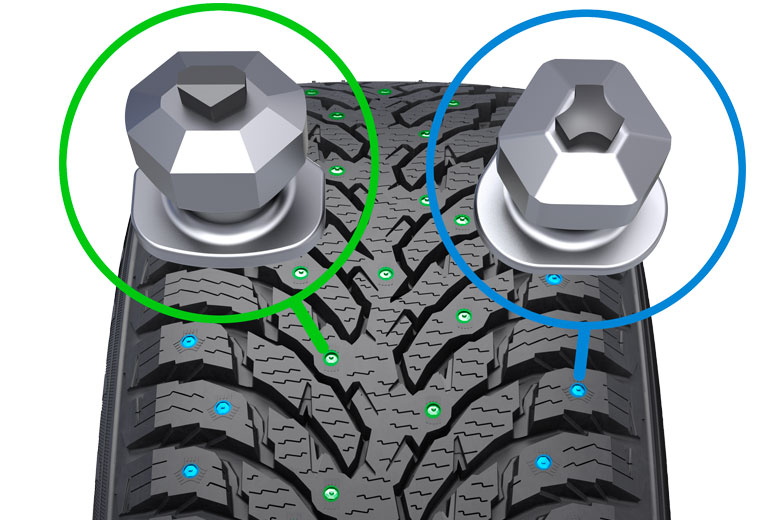 Шипы в плечевых зонах были разработаны для того, чтобы обеспечить первоклассное поперечное сцепление, что особенно необходимо при прохождении поворотов на скользкой дороге. Корпус данного шипа и фланец отличаются от корпуса и фланца шипов в центральной части протектора, а трехосный твердосплавный штифт износостойкого элемента был разработан так, чтобы эффективно выдерживать боковые нагрузки. При повороте транспортного средства кромка шипа всегда будет захватывать максимальную площадь в пятне контакта, что увеличивает поперечное сцепление. Это техническое новшество обеспечивает улучшенную, точную управляемость на скользкой дороге.